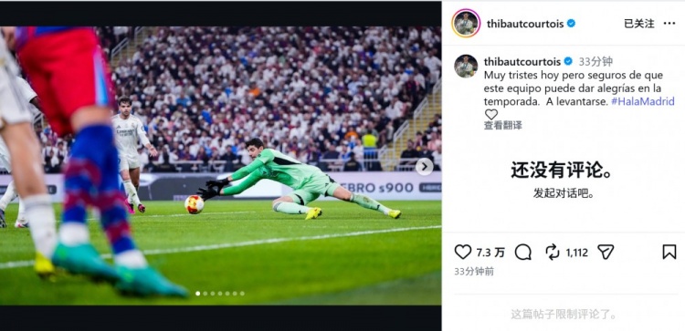 皇马门将库尔图瓦社媒写道:“今天非常难过,但我们坚信这支球队本赛季能给球迷带来快乐,让我们重整旗鼓。”